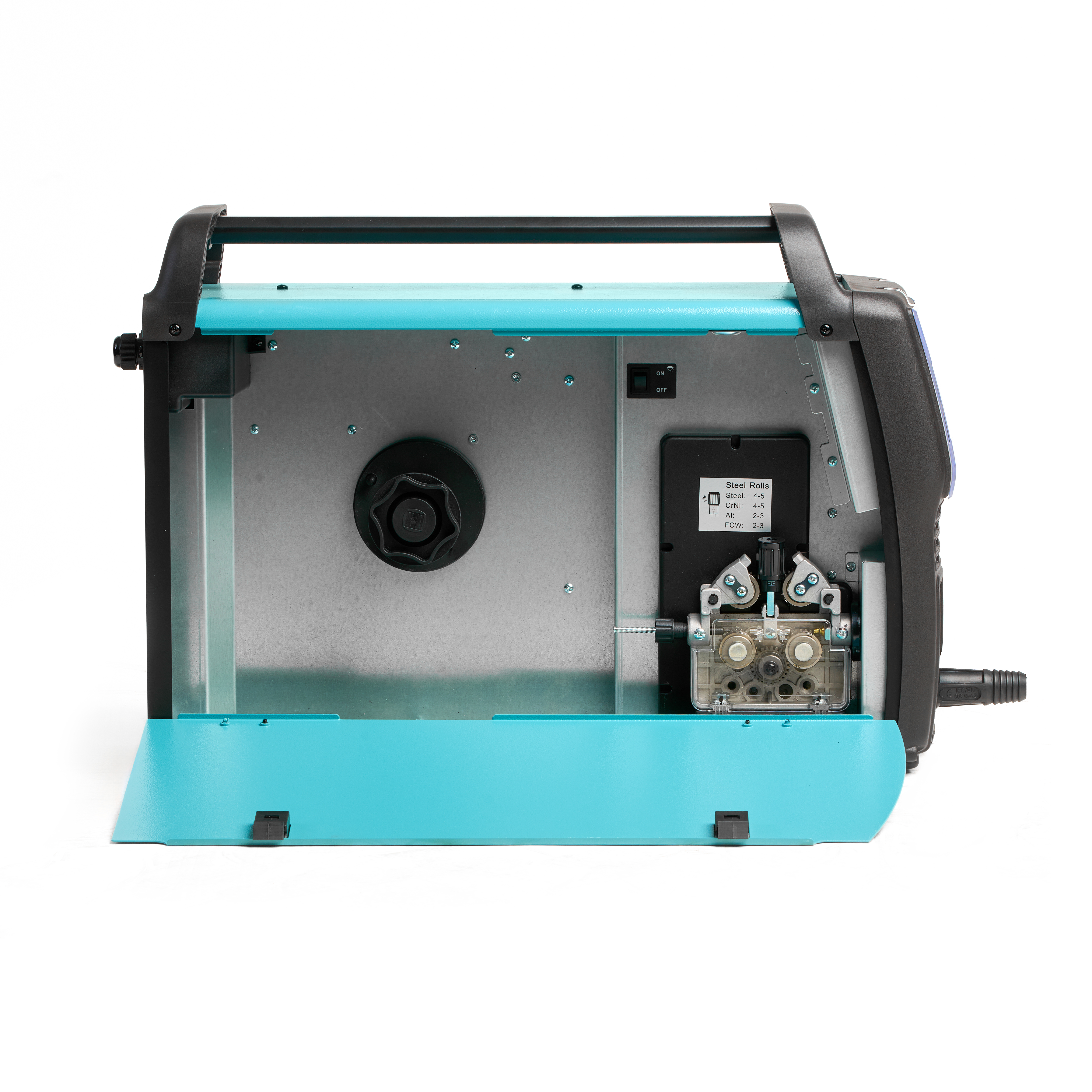 - Мощный 4-х роликовый механизм подачи проволоки, для уверенного использования полуавтоматических горелок максимальной длины.